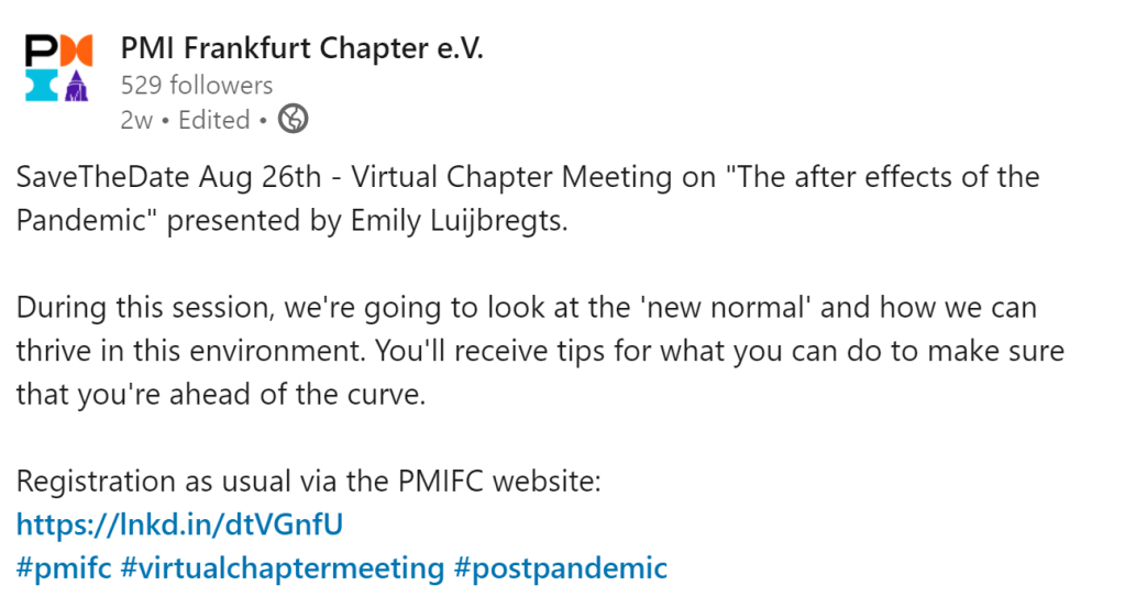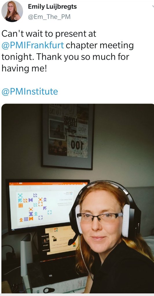 I am regularly approached by different chapters and will always try to make time for the community if i can, so I was very excited to be asked by the PMI Frankfurt Chapter if I’d be interested in speaking.