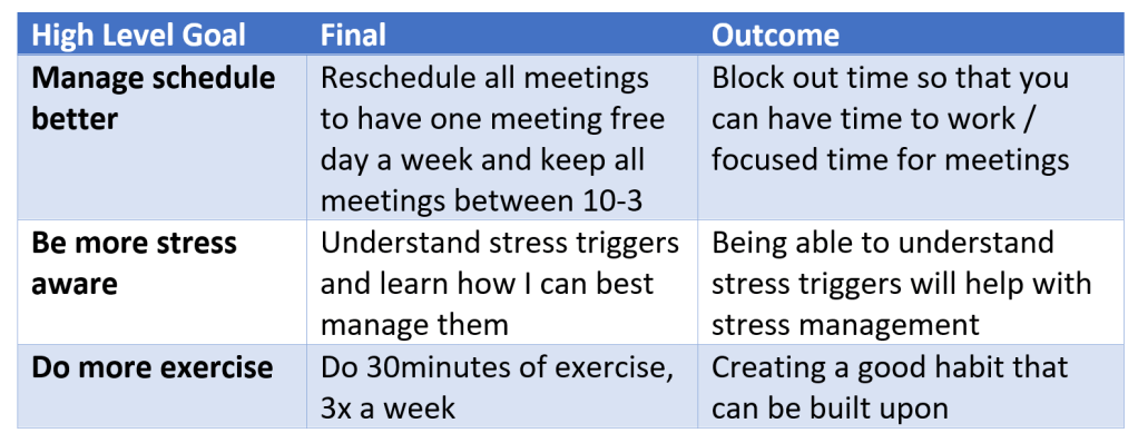 This can be the most difficult thing! I recommend breaking it down into manageable bite size chunks. Look at the image that I’ve created below for some advice for what you can do to understand your goals and how you want to get there.